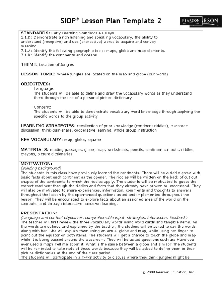 Siop Lesson Plan Template2 PDF Lesson Plan Vocabulary